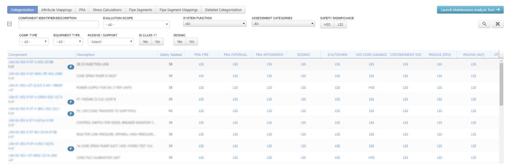 Evaluate critical attributes seamlessly, aided by the intuitive search criteria and function grouping. Effortlessly modify data, whether you’re tending to a single component or implementing bulk changes. Decisively answer qualitative questions to determine a component’s High Safety Significance (HSS) or Low Safety Significance (LSS), ensuring the human element remains central to safety designations. Simplify stress calculations and pipe segment management, enabling you to intuitively determine passive safety significance.