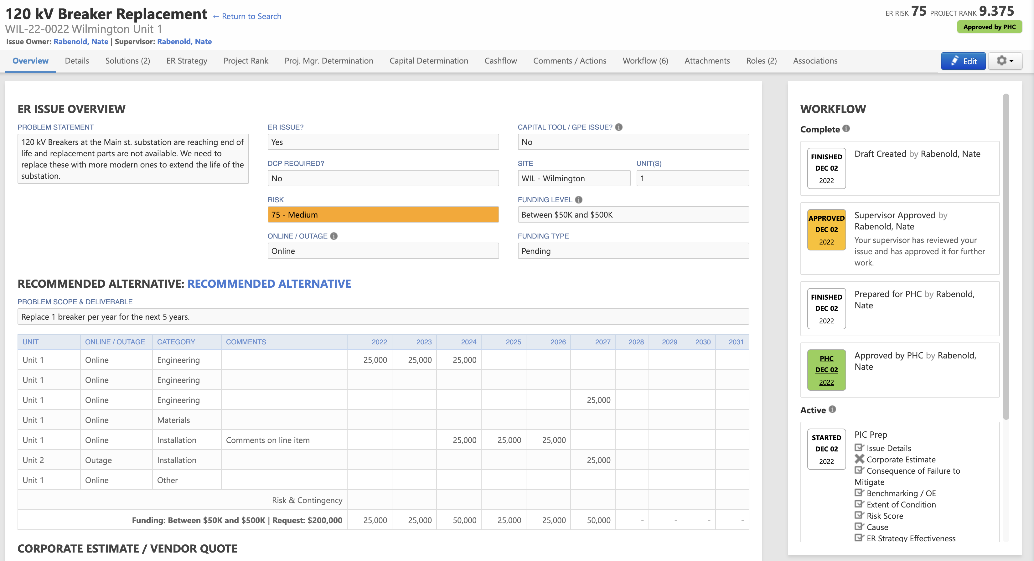 Proactively manage long-term issues and effectively mitigate risk by utilizing an integrated risk process that seamlessly links to capital planning and asset health. Compare alternatives and determine the best solution by analyzing risks, benefits, and cash flows. Complete risk assessments, tracking mitigation and bridging strategies while ensuring the most impactful risks are addressed. The configurable issue ranking feature aligns with your existing process and guides users through the ranking process, ensuring prioritization of issues in a step-by-step manner.