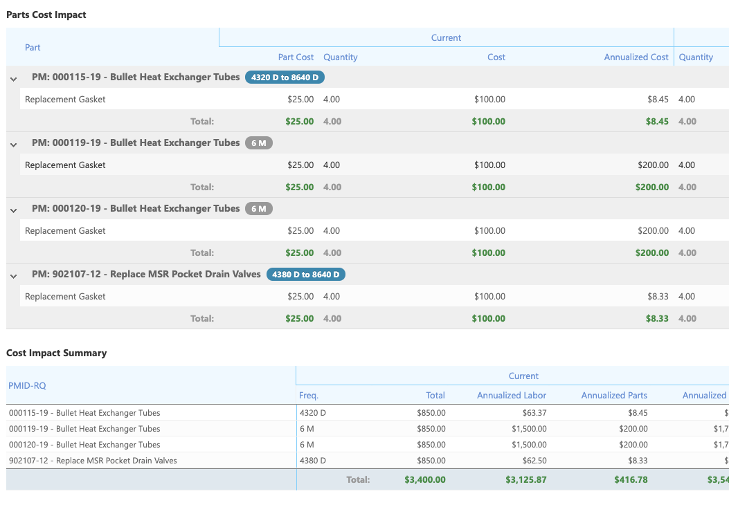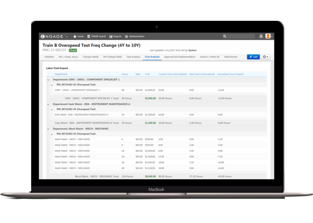 An important metric of the PM Change process is the cost variance from implementation. This cost is very difficult to assess without manually sourcing and compiling data from multiple systems. ENGAGE: Strategy tracks costs at the PM level and annualized impact is calculated with the PM change request. You spend less time calculating costs savings, and can more easily make the case for a PM change to leadership.