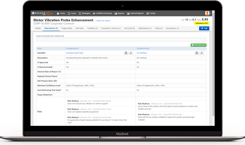 As Issues are identified, users can compare any number of alternative solutions, including analysis of risks, benefits, and cash flows for each, to determine the best strategy to mitigate an Issue. Once an issue and its alternatives are created, users can initiate the processes for ranking and prioritization, alternative selection, and committee approval. Milestones, attachments, and associated items, such as action requests and work orders, can all be managed on an issue.