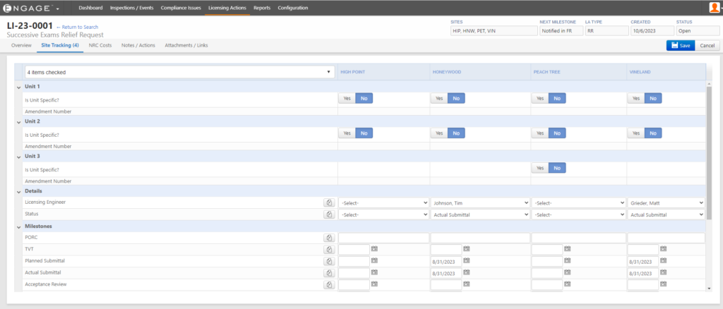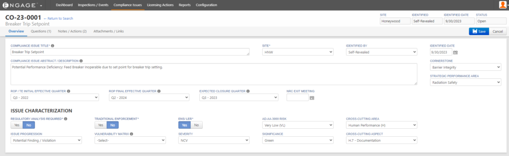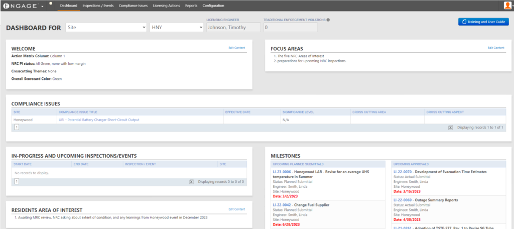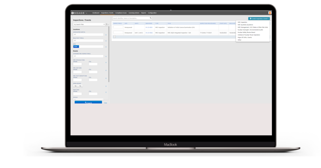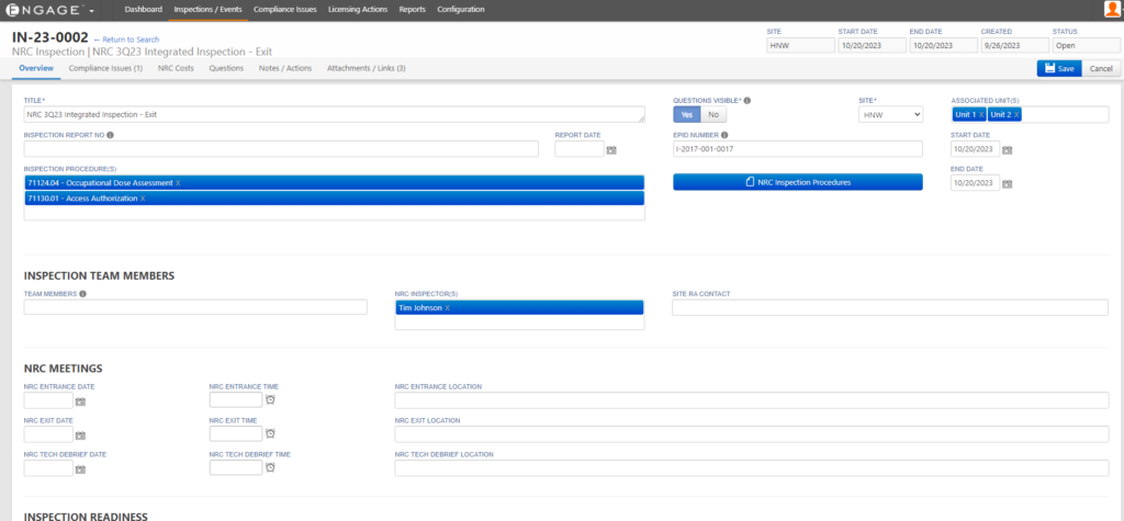 - Inspection Tracking: Monitor Inspections, including related issues, inspector questions, and NRC Costs